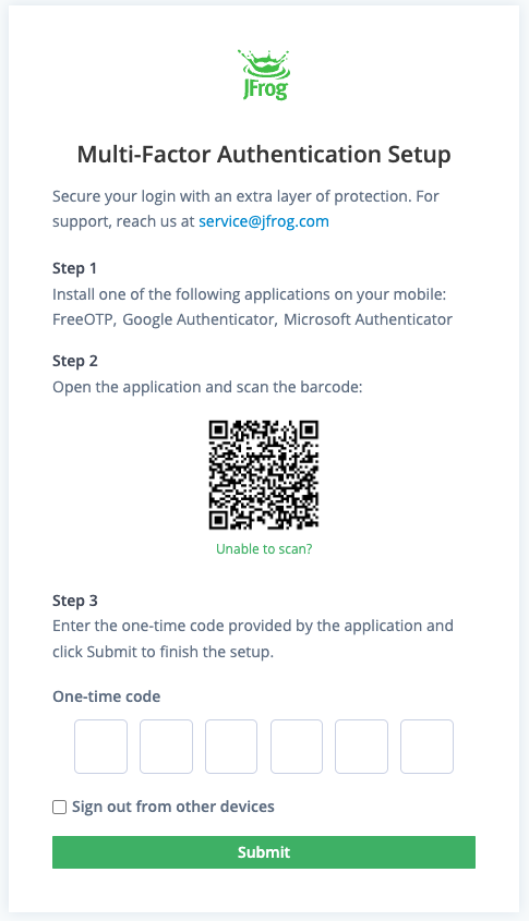 Need Help? If you need to reconfigure MFA or if you lose access to your authenticator app, please reach out to us at service@jfrog.com for assistance.