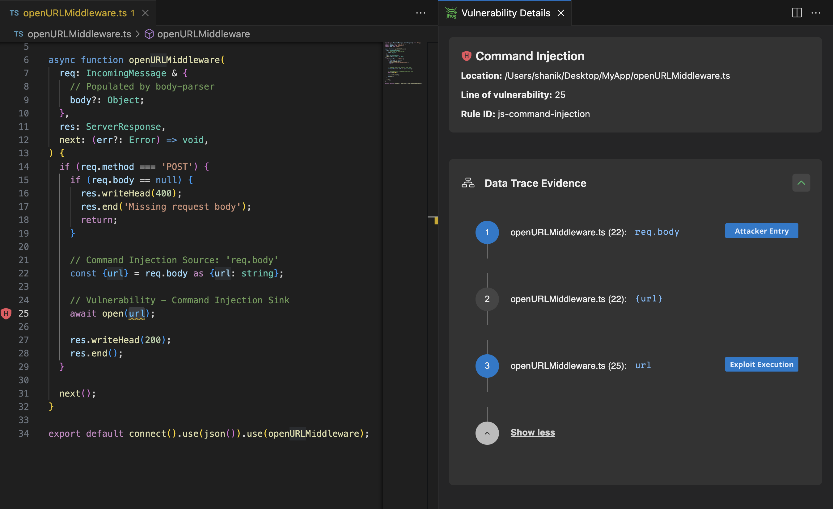 JFrog SAST highlights the vulnerability in the code along with its details and provides Data Trace Evidence that shows the data flow from the user-input req.body field until it is used as an input to the dangerous open function.