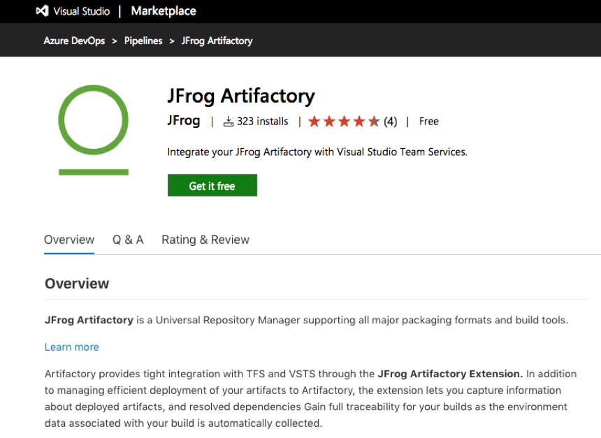 - Download the JFrog Artifactory Extension from the Visual Studio Marketplace and follow the installation instructions in the Overview.