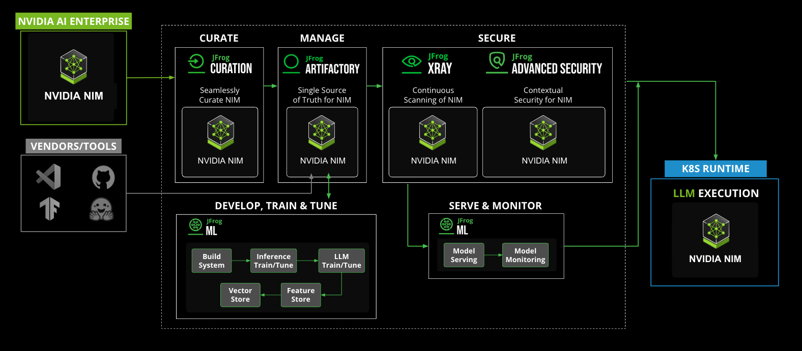 The NVIDIA Enterprise AI Factory validated design ensures that organizations can operate AI agents in a secure and compliant environment. The integration of JFrog with popular CI/CD tools, combined with the NVIDIA AI Enterprise platform (including automated training orchestration, secure model deployment via NIM, and NGC registry integration), allows teams to: