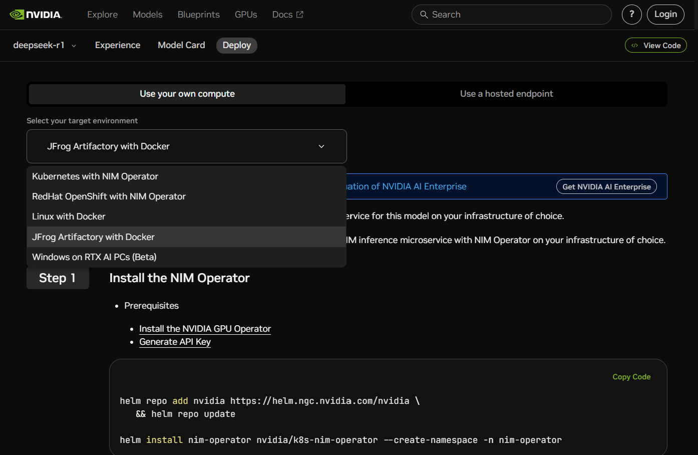 NVIDIA AI models, including those containerized and packaged as NVIDIA NIM, available for testing at build.nvidia.com and download from NVIDIA NGC, can be automatically cached in the JFrog Platform. NVIDIA NIM containers are easily tested and downloaded into Artifactory for approval, with easy instructions integrated into the build.nvidia.com page.