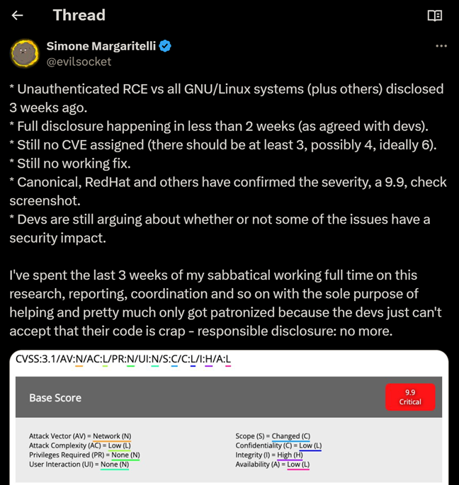 On September 23rd, Twitter user Simone Margaritelli (@evilsocket) announced that he has discovered and privately disclosed a CVSS 9.9 GNU/Linux unauthenticated RCE, which affects almost all Linux distributions, and that the public disclosure will happen on September 30th,