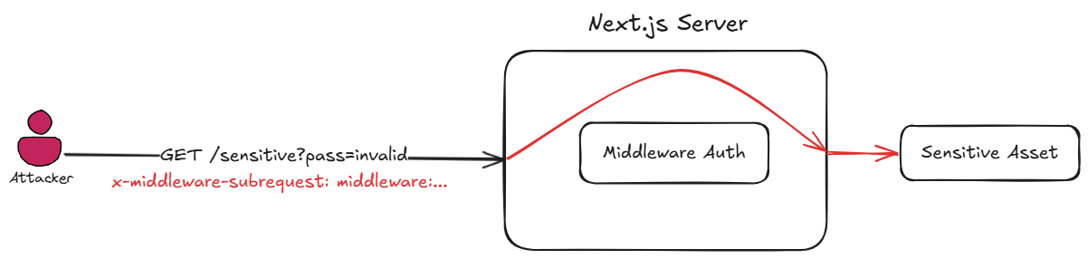The vulnerability stems from the inconsistent handling by Next.js of the custom x-middleware-subrequest headers. When this header is included in requests to protected routes, Next.js incorrectly allows the request to bypass middleware execution entirely. The header forces the Next.js runtime to skip the middleware evaluation phase while still processing the underlying route handler.
