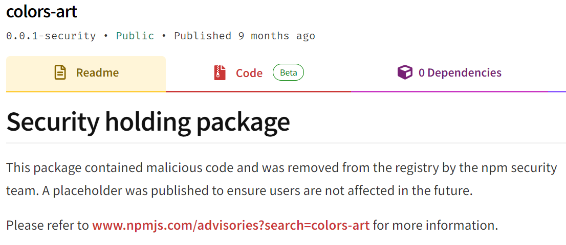 The tracking in npm is slightly better. Reported malicious packages are replaced with dummy code and they’re tagged as a Security holding package, as you can see in this screenshot below of a malicious package called colors-art in npm: