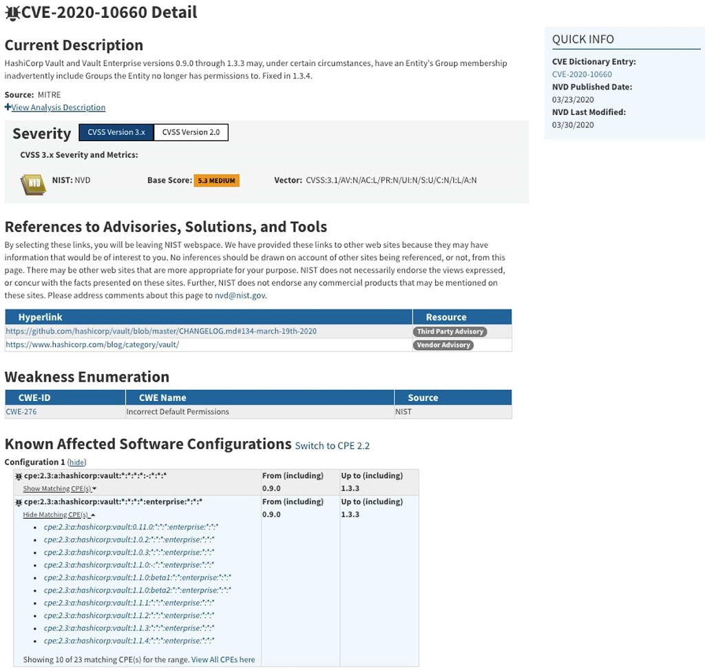 Another vulnerability was identified in Vault Enterprise such that, under certain circumstances, existing nested-path policies may give access to namespaces created after-the-fact. Luckily, there was a change made to fix these vulnerabilities in version 1.3.4.