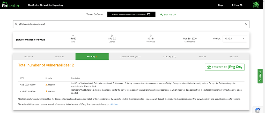 Once all components and dependencies have been identified, their information is cross-referenced with other vulnerability feeds and databases to alert you of any potential threats. Basic Xray vulnerability scanning for Go modules is available for free on GoCenter, shown in the Security tab: