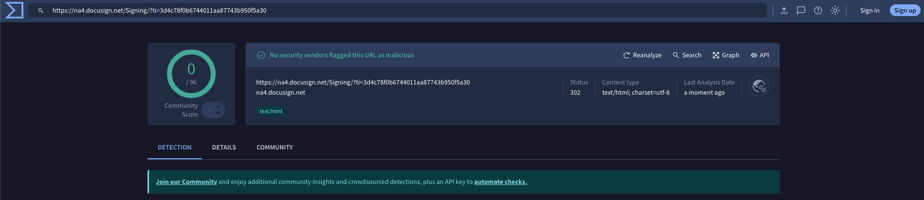 The phishing URL including DocuSign is undetected by Virus Total