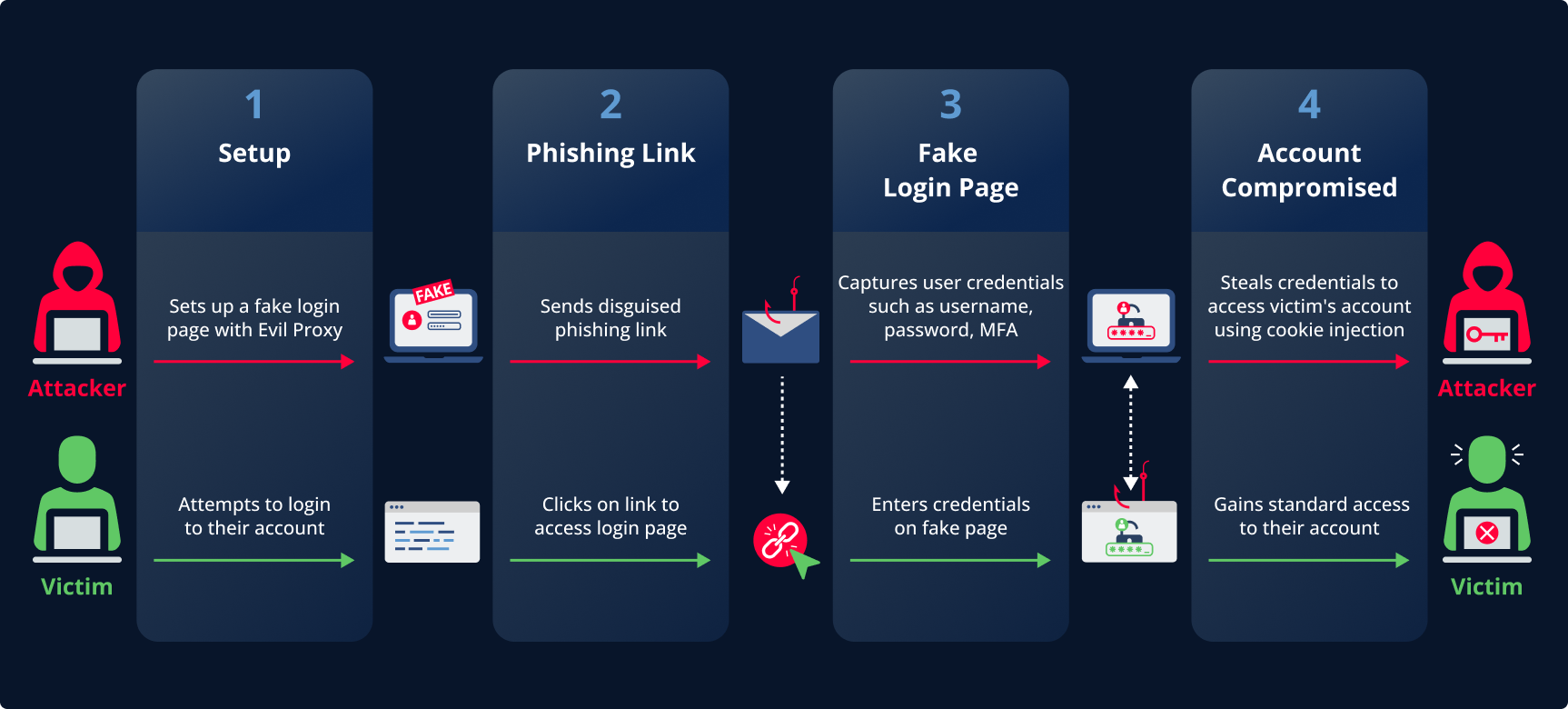 Evil Proxies operate on the Reverse Proxy principle, where the attacker leads the victim to click a malicious link that appears to look like a legitimate login page.