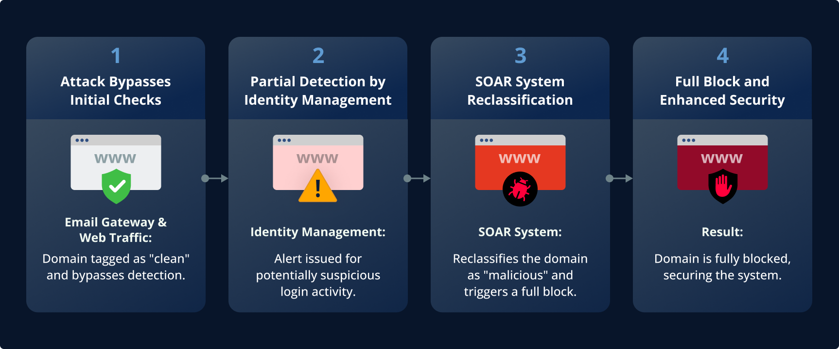 The Email Gateway and Web Traffic monitoring systems initially flagged the attack domain as “clean,” meaning they did not detect it as a threat. The Identity Management system, however, identified suspicious activity related to this domain and partially blocked it based on the detected anomaly.