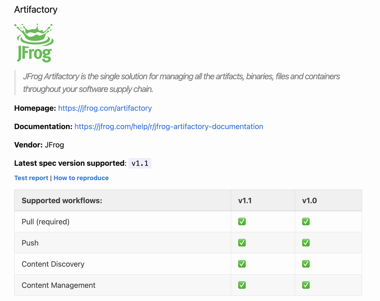 JFrog is now fully certified to the OCI v1.1 standard. We are proud to be one of only two vendors who have made this commitment thus far. Available from JFrog Artifactory V7.90.1 for OCI and Helm OCI repositories, JFrog users can now get everything they need for their OCI packages.