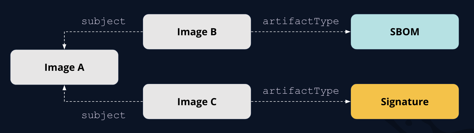 Now, let’s say you want to retrieve only specific artifact types. Let’s assume Image B is an SBOM artifact, and Image C is a signature artifact. Using the artifactType field, you can denote these references.