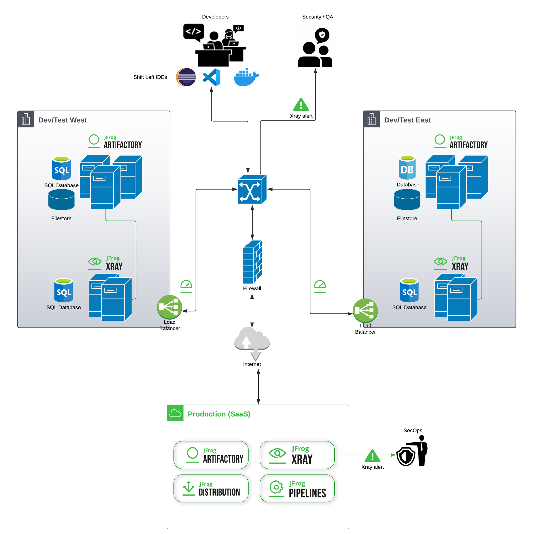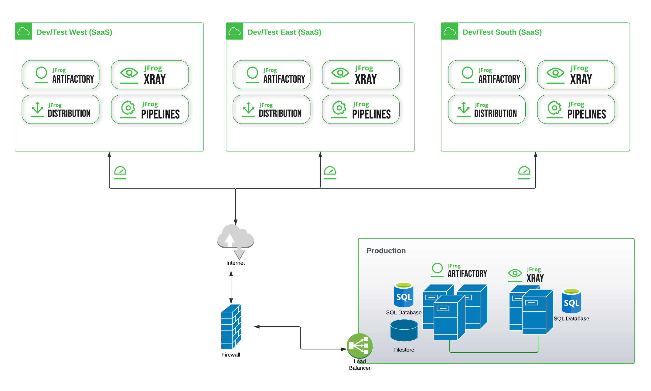 While dev/test environments are fast and messy, production repositories need to be clean and orderly. Therefore, it’s a very common practice to divide SDLC pipelines across JFrog Platform deployments for each of these purposes.