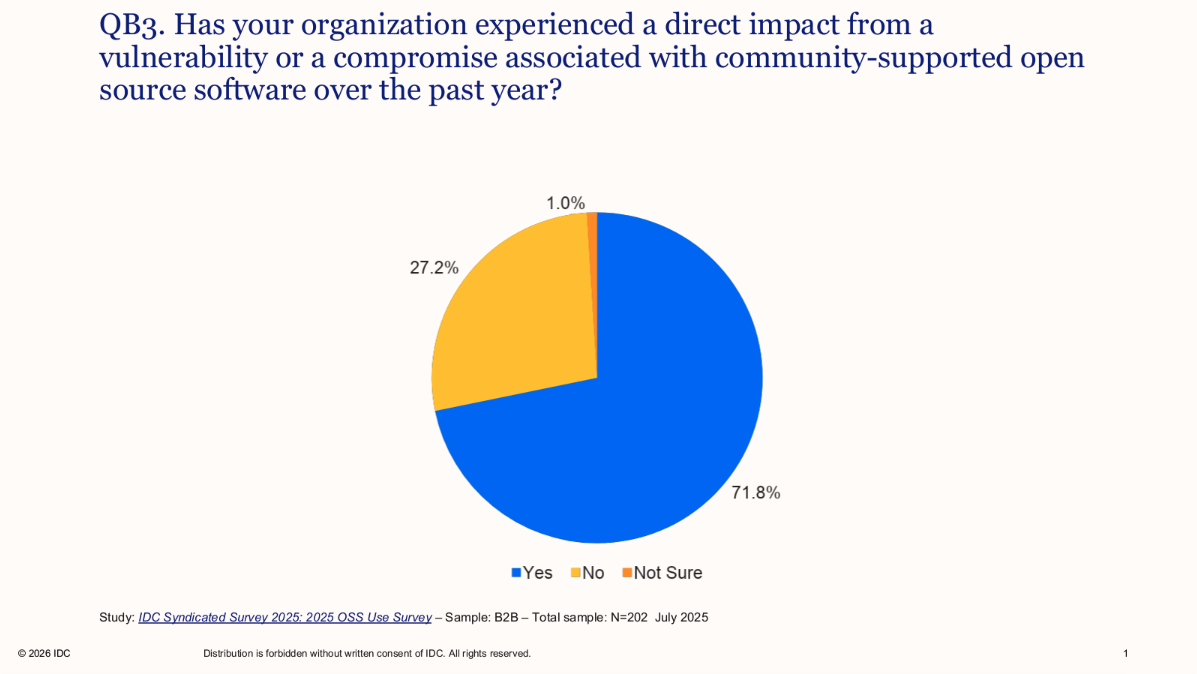 The gap between artifact publication and detection creates an opportunity for adversaries, and widely adopted components introduce systemic exposure when updates are consumed without vetting. IDC data confirms the breadth of the problem: 71.8% of organizations report a direct impact from a vulnerability or compromise in community-supported open source software in the past year (IDC’s Open Source Software Use Survey, July 2025).