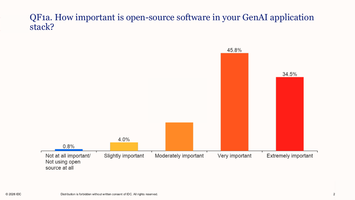 The urgency doesn’t stop at traditional application libraries. Open source is also foundational to enterprise AI initiatives, and 80% of organizations consider open-source components very or extremely important within their GenAI application stack, according to IDC’s Global AI Technology Trends Survey (June 2025). As AI models, frameworks, and supporting tooling get incorporated into production applications, the dependency risk profile expands with them.