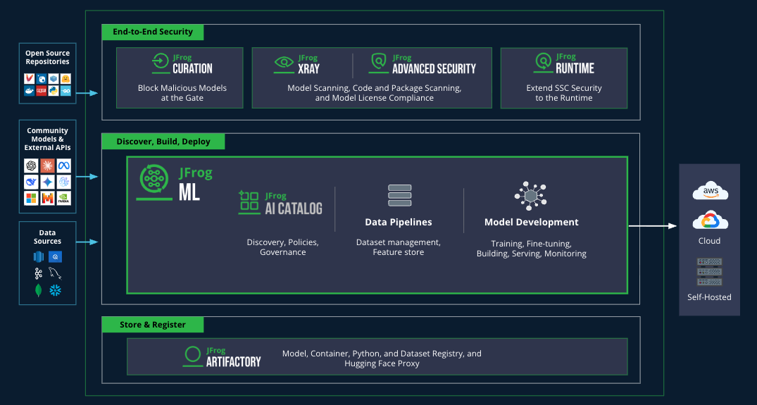 But the AI Catalog is just the beginning. It is the cornerstone for leveraging the full power of JFrog’s platform for the entire model development lifecycle. Once you have a governed and trusted catalog, you can enjoy an effortless and rapid model development experience that streamlines the entire lifecycle from training to deployment, enabling an accelerated path to production.