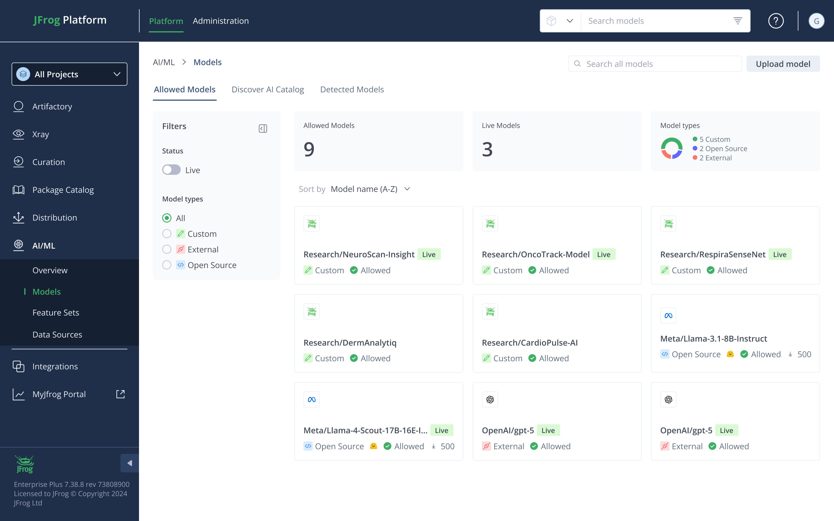 The AI Catalog extends JFrog’s security and governance framework to your entire AI model supply chain for end-to-end control.