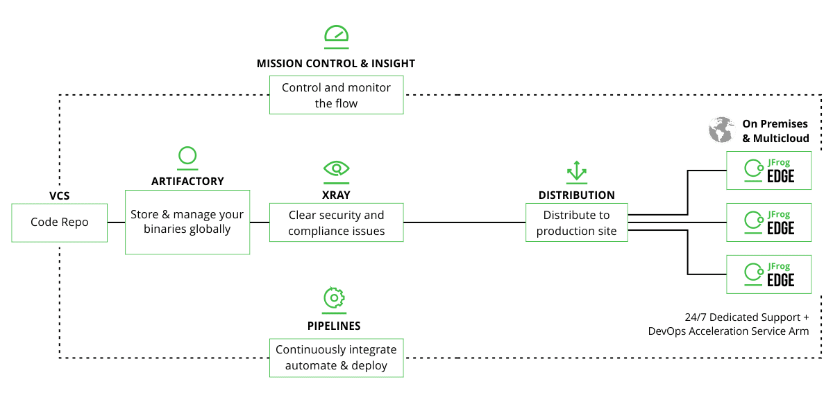 Pipelines is the CI/CD component of the JFrog DevOps Platform end-to-end set of solutions for “one-stop DevOps.” Powered by Artifactory, the JFrog Platform provides everything you need to manage your organization’s software delivery, from artifact repositories, distribution of binaries, security scanning and CI/CD automation.