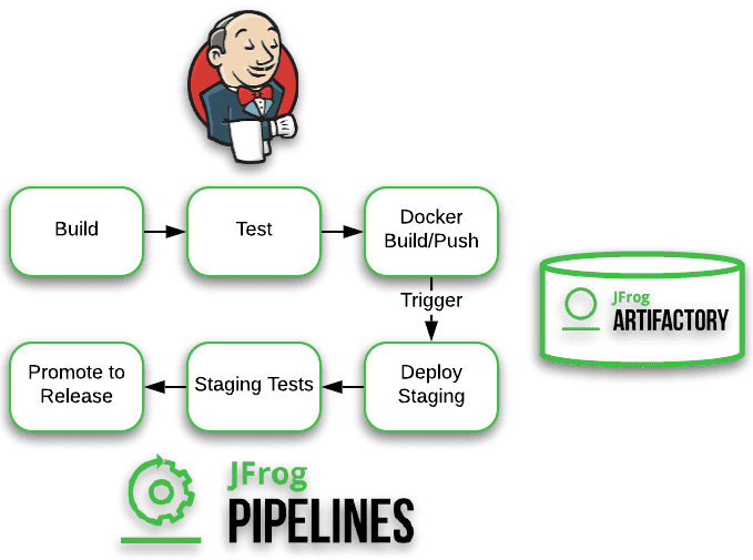 Our JFrog Pipeline will trigger through the build info pushed by the Jenkins pipeline, and perform the remaining deployment and staging actions to release.