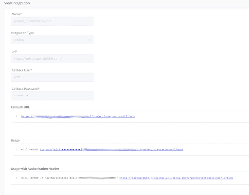To connect Jenkins to JFrog Pipelines, we must first create a Jenkins integration in our Pipelines deployment, here called jenkins_openshiftk8s_com. This UI provides our curl webhook command above, and enables our Jenkins pipeline to trigger our JFrog pipeline.