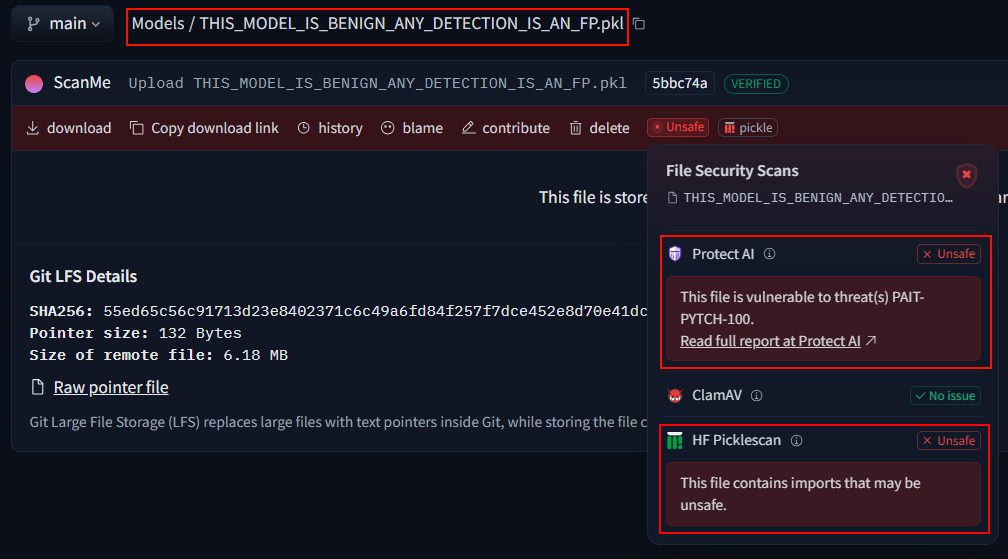 Let’s look at a concrete example: One of the models we’ve noticed that’s marked as “Unsafe” has a very explicit filename: THIS_MODEL_IS_BENIGN_ANY_DETECTION_IS_AN_FP.pkl. This is a model uploaded by an unknown 3rd-party, and true to its name, it really isn’t dangerous—it’s just a harmless test model. Yet, it is flagged as unsafe by the current relevant scanners integrated into Hugging Face.