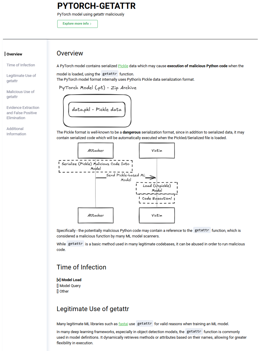 To better understand the security risks associated with different model types, we have categorized them based on their attack surfaces, each with a dedicated “Model Threats” webpage explaining the potential vulnerabilities in detail. These resources provide insights into how various formats, such as Pickle, TensorFlow, GGUF, and ONNX can be exploited and what specific threats users should be aware of when integrating pre-trained models into their workflows.