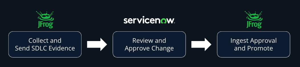 - Accelerated, Trusted Delivery: Once a change is approved in ServiceNow, the decision is automatically passed back to JFrog. This triggers a secure, policy-driven promotion of the application to production, ensuring only compliant and trusted software reaches your customers.