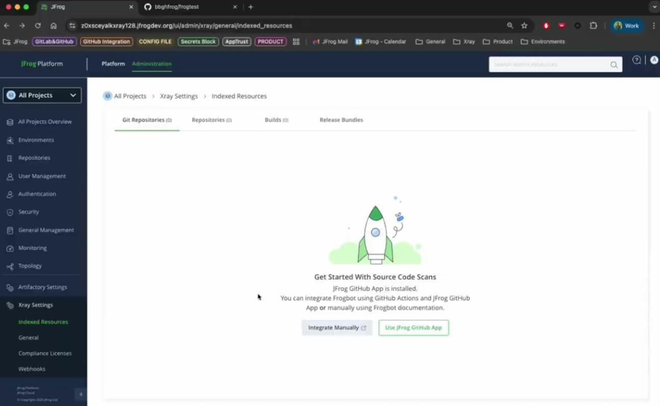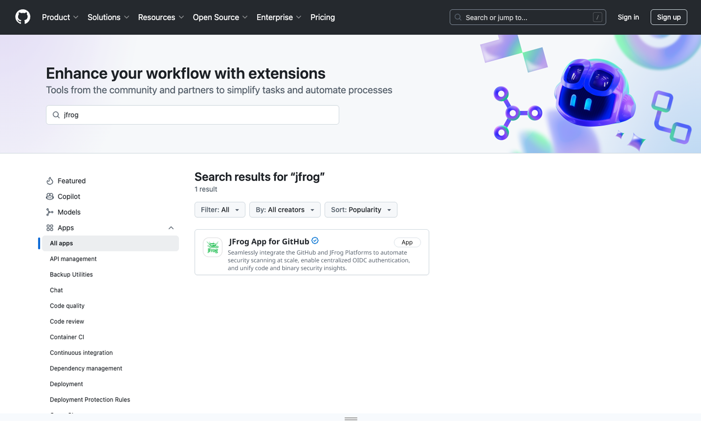 - Simplified Setup: One-time, automated, organization-level installation instantly connects GitHub and JFrog resources with secure authentication.