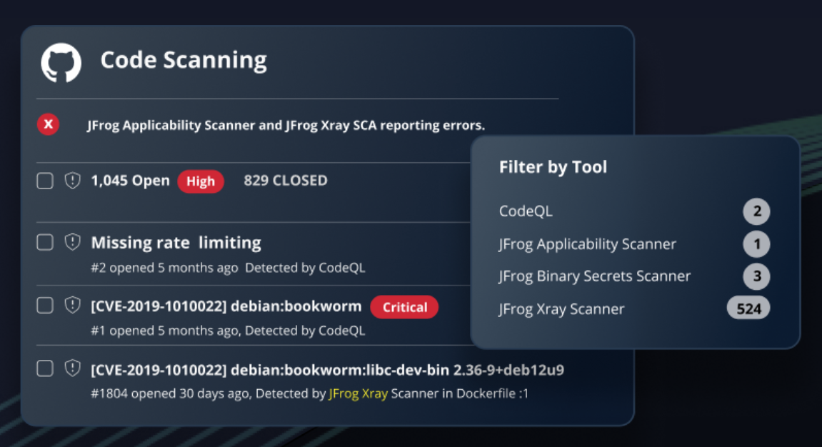 - Unified Security Results: Push JFrog Advanced Security binary scan results directly into GitHub’s Code Security dashboard for a single view of source and binary security vulnerabilities.