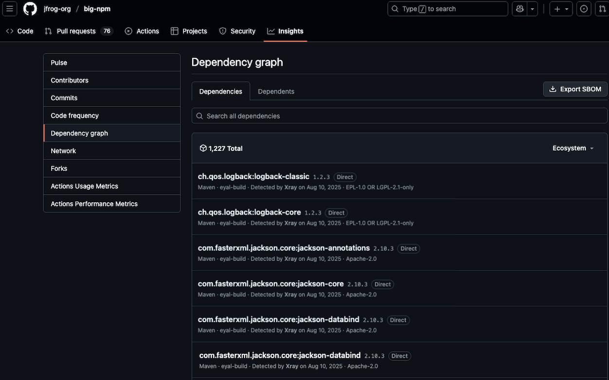 - Holistic SBOMs: Merge GitHub’s source SBOM with JFrog’s binary SBOM inside GitHub Dependency Graph for an accurate, end-to-end software bill of materials.
