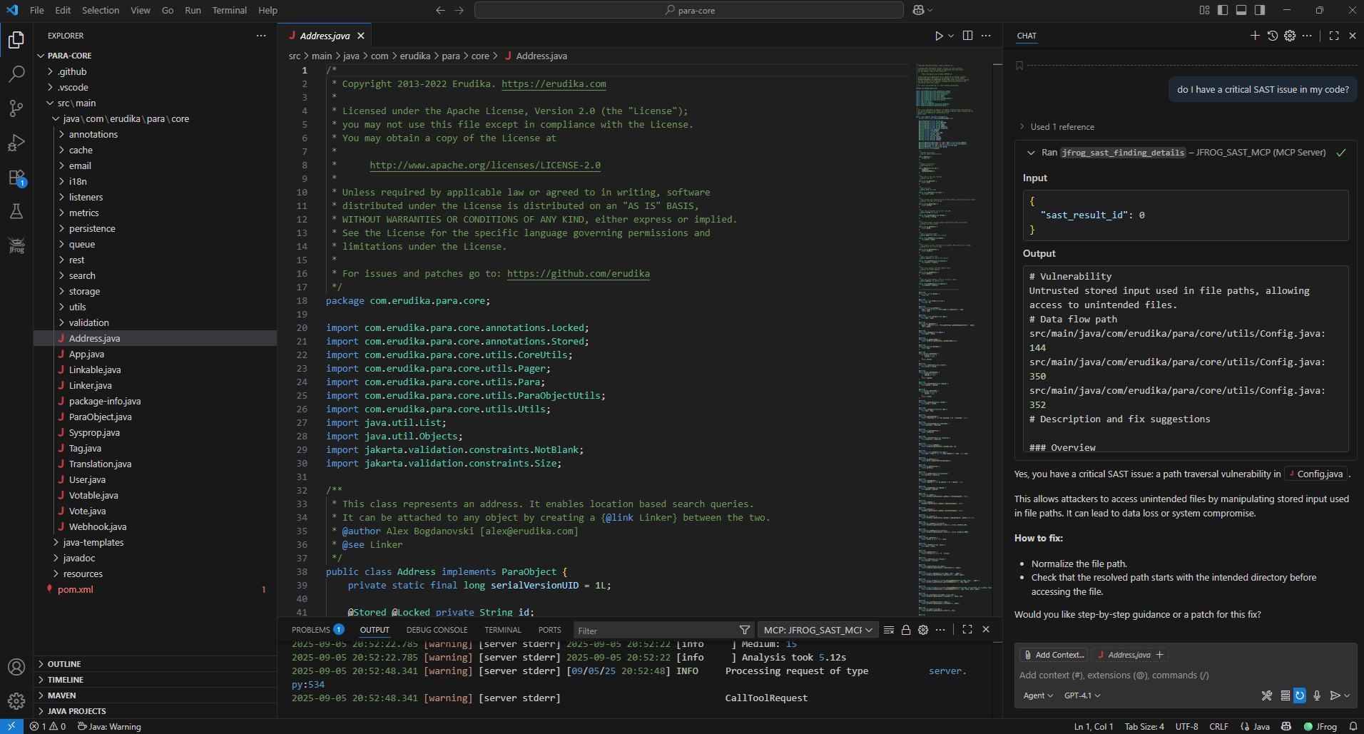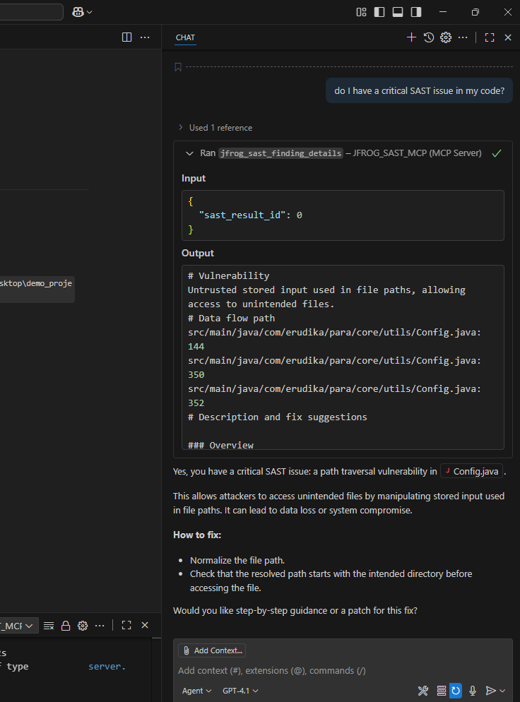| Agentic Remediation with JFrog Catalog + Curation and JFrog SAST Integration with Copilot (via JFrog’s MCP Servers) | Secure guardrails for code and package choices with AI-assisted remediation |