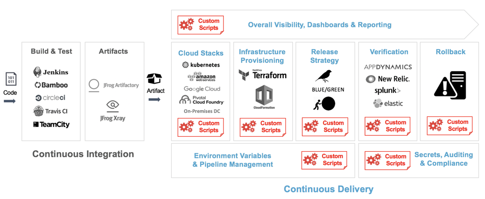 Taking code to artifact (Continuous Integration) has largely been solved by CI servers like Jenkins, and JFrog has been a pioneer and leader in how those artifacts are managed.