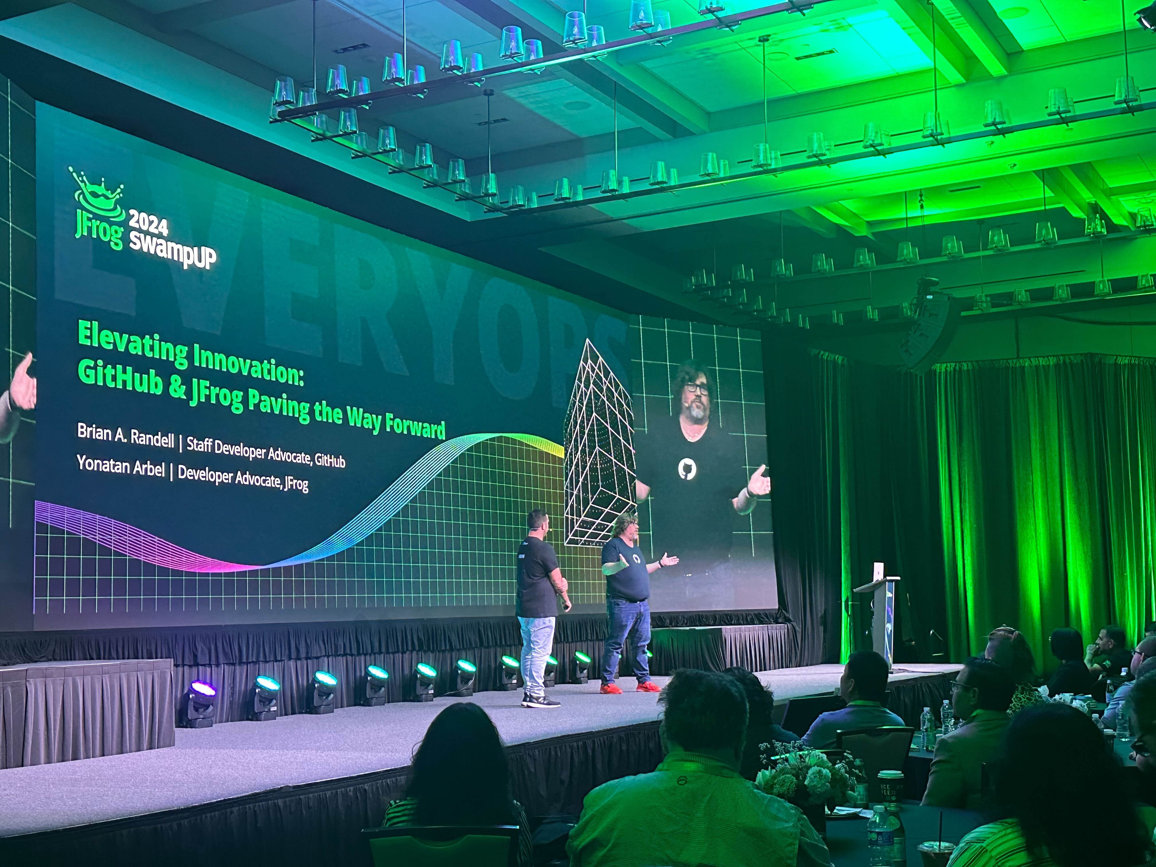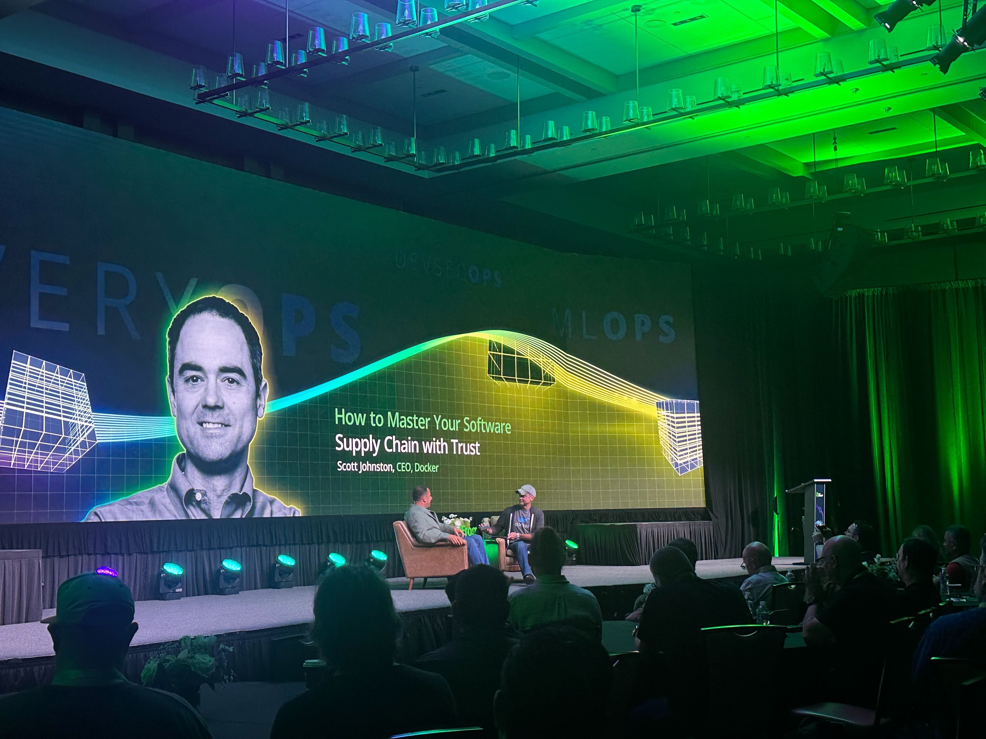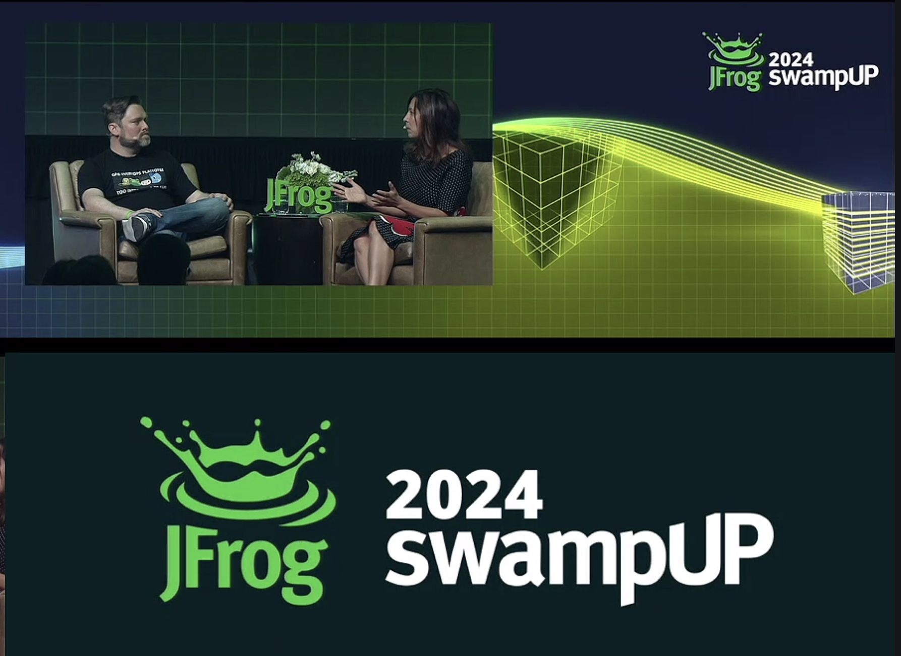 - McKay then announces that swampUP 2025 will take place in Napa Valley! She then introduces JFrog’s CEO and Co-founder, Shlomi Ben Haim, who is joined onstage by Docker CEO, Scott Johnston for a fireside-style chat.
