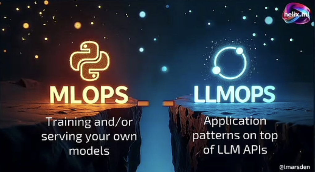 - Marsden moves on to talk about the division between MLOps and LLMOps, and how the goal is to bridge that “chasm”.