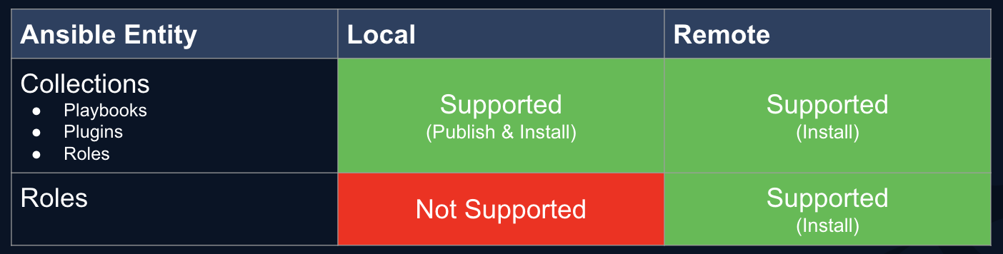 - Local Repositories – Private registries that are accessible only within your organization’s network. Ansible local repos will only support Collections for now.