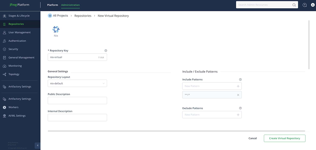 In the Artifactory Administration tab, create a new Nix repository. We recommend starting with a Virtual Repository, which aggregates your local and remote sources under a single URL to simplify developer configuration.