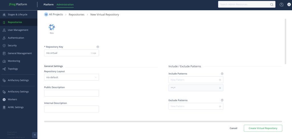 In the Artifactory Administration tab, create a new Nix repository. We recommend starting with a Virtual Repository, which aggregates your local and remote sources under a single URL to simplify developer configuration.