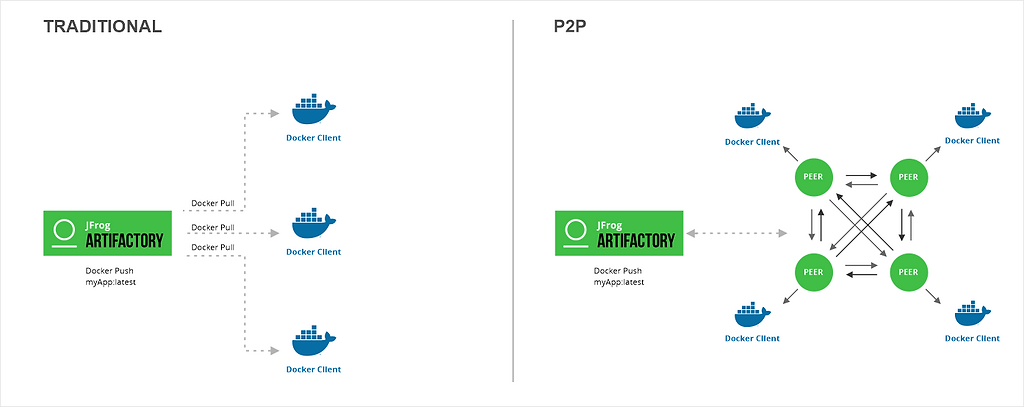 JFrog is pleased to introduce Peer-to-Peer (P2P) Distribution to help deliver content to huge K8s cluster runtime environments efficiently and at scale. Available for Enterprise+ users, this cooperative method of delivery helps overcome download burst latency challenges that can occur from exhausting a single distribution server.