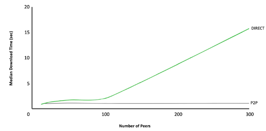 The P2P architecture enables you to increase the number of concurrent downloads while reducing the load on the repository manager server – all without affecting the total download time. When looking at the curve below of download time versus the number of peers, using P2P flattens the curve throughout the graph; the download time remains constant as the number of peers increases.