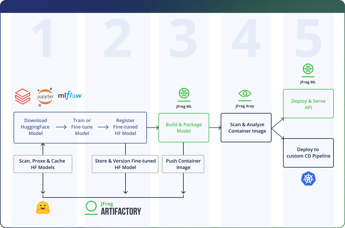 The diagram below illustrates this 5-step journey, showing how the Databricks and JFrog platforms work together at each stage.