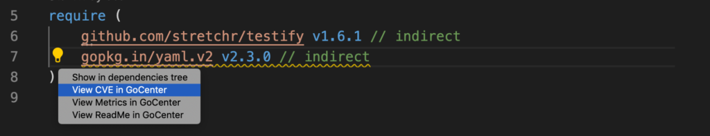 Everything looks good, but wait — when I go to the go.mod file I notice a wavy underscore under gopkg.in/yaml.v2 v2.2.7. It looks like my test files actually have a vulnerability in the module yaml.v2 v2.2.7.