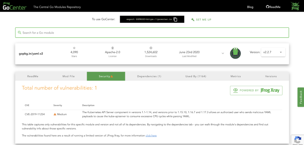 The VS Code extension draws this security information from JFrog GoCenter, our free public repository of over 740,000 (and growing!) open source Go module versions. In addition to being available as a fast, public GOPROXY, GoCenter performs deep-recursive scanning of all Go modules with JFrog Xray, tagging each with security information from the National Vulnerability Database.