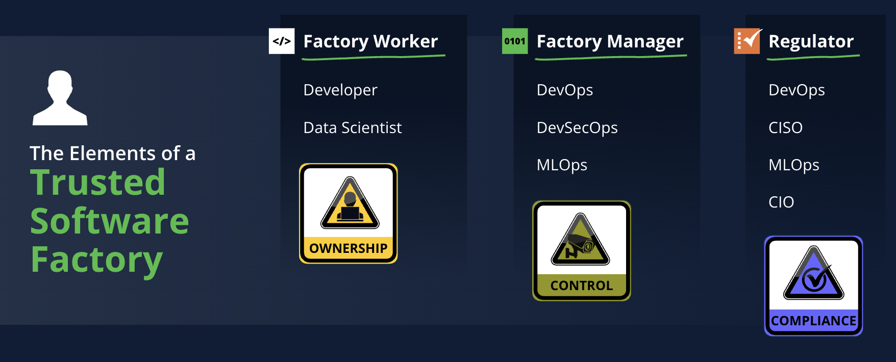 Imagine software development as an industrial factory or manufacturing plant. To run this trusted “software factory” effectively, three key elements determine success: Ownership, Control, and Compliance.