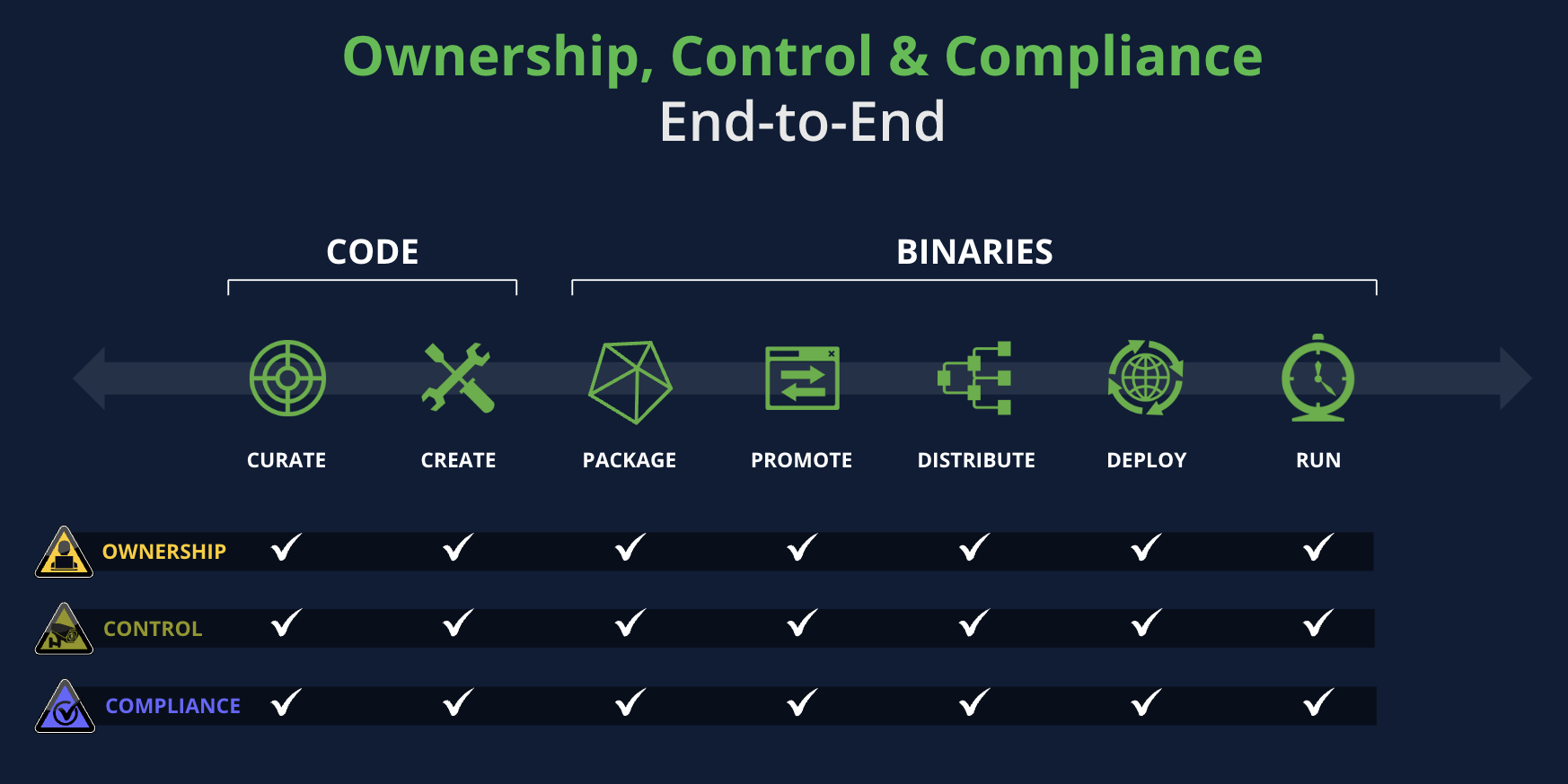 The key to mastering the balance between speed to market and building trust is to unify your software factory: bringing Ownership, Control, and Compliance together into one system of record.