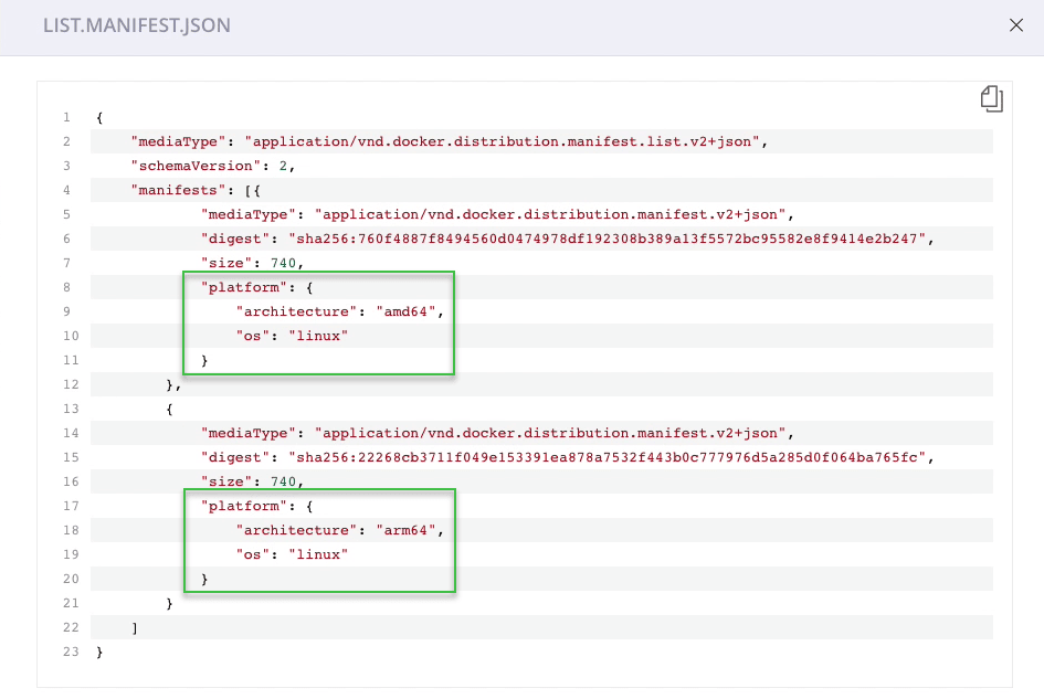 The manifest list (list.manifest.json) produced by Docker is a “manifest of manifests” for our multi-arch image. Also called a “fat manifest,” it identifies the Docker images within the set and what architectures (both OS and processor combination) each image is targeted to run on.