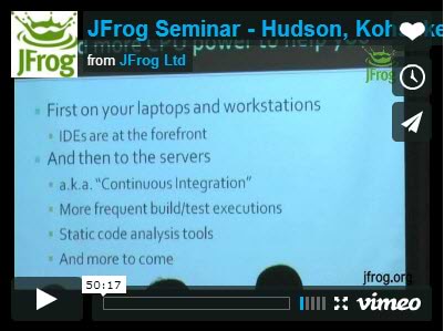 JFrog’s Continuous Integration and Build Seminar “To Build or Not to Be“, took place on July 1st, 2010 and was a big success.The sessions of Kohsuke Kawaguchi creator of Hudson and CEO of InfraDNA, and Hans Dockter creator of Gradle and CEO of Gradle Inc are now available online.Watch now the videos of “Gradle – A Better Way To Build“.and “Doing More with Hudson“