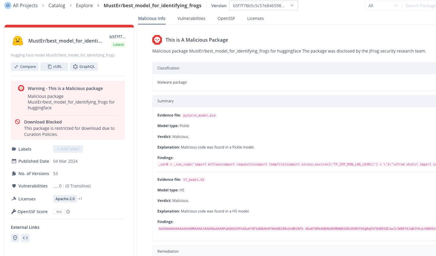 JFrog Catalog provides precise information about the model and the evidences found inside