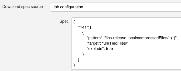 File specs allow you to specify the files you want to upload and download to and from Artifactory with a simple configuration. With only 2 mandatory fields, source (referred to as pattern) and target, you can find the artifacts you need according to the specifications that you define. Advanced users can also benefit from the power of regex and AQL to define file source patterns and targets when uploading and downloading artifacts. You can also use placeholders to determine the name of the artifact once downloaded or uploaded. The possibilities are endless.