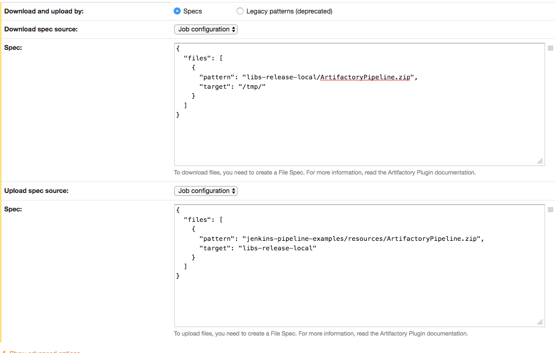 File specs are supported for both generic and pipeline Jenkins jobs using the Jenkins Artifactory plugin. Below is an example script showing how to upload a file to Artifactory in a Jenkins pipeline job.