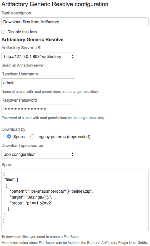 There are 2 separate generic jobs, deploy and resolve, that are used to upload and download files from Artifactory using the Bamboo Artifactory plugin. Just as in the previous CI servers, the option to choose either a file or job configuration as a spec source is also available here. Below are examples for each.