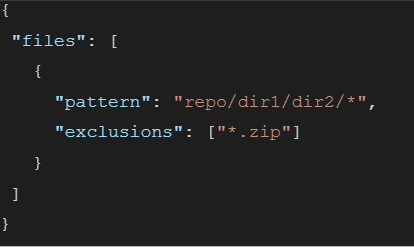 File spec is a JSON language that allows performing operations from/to Artifactory. For example, to download all files in repo/dir1/dir2/* except files that ends with “.zip”, use the following spec:
